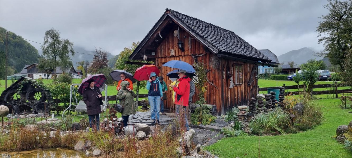 Niemand ließ sich durch das schlechte Wetter abhalten, an der Exkursion teilzunehmen. Zur Belohnung hörte der Regen auch kurz nach Beginn der Gartenführung auf. Gespannt folgten die Besucher:innen Leo Maders Ausführungen, alle Fragen wurden ausführlich beantwortet und manch hübsches Fotomotiv eingefangen, obwohl der Morgenfrost ein paar Tage zuvor den herbstlichen Blumenschönheiten arg zugesetzt hatte.
